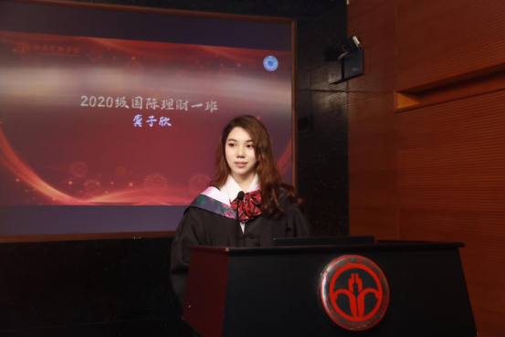 20級國際理財一班的龔子欣同學(xué)作為優(yōu)秀畢業(yè)生代表發(fā)言。在回顧三年廣金生活的美好之余,也表達了對父母、學(xué)校、學(xué)院、老師和同學(xué)的感謝,對未來(lái)出國學(xué)習的憧憬與展望。