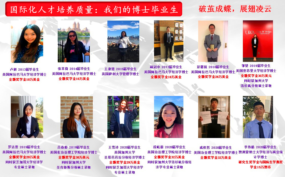 畢業(yè)感言:首先要感謝前兩年在廣金的學(xué)習,針對性的中英雙語(yǔ)教學(xué)或全英教學(xué)讓我有機會(huì )全面提高專(zhuān)業(yè)和英語(yǔ)綜合素質(zhì),同時(shí)在課堂中得到了獨立思考、團隊協(xié)作以及演講展示的機會(huì ),給了我許多培養主觀(guān)能動(dòng)性的機會(huì ),為我后兩年的國外學(xué)習打下了堅實(shí)的基礎。其次要感謝西阿拉巴馬大學(xué)的學(xué)習經(jīng)歷,在導師的幫助下,我確定了經(jīng)濟學(xué)為目標所在,并將考取優(yōu)秀的經(jīng)濟學(xué)研究生院校作為首要目標。為了能夠向各大研究生院校展現出色的能力,我在各個(gè)方面都做出了充分的準備。整整三個(gè)月的埋頭苦干,換來(lái)了GRE 327分(滿(mǎn)分340)的成績(jì);為了豐富研究經(jīng)驗,利用寒假時(shí)間投入到了經(jīng)濟學(xué)項目研究當中,最后在教授的指導下成功入選并在達拉斯第13屆經(jīng)濟學(xué)學(xué)者本科生研究項目中展示研究成果。志之所趨,無(wú)遠弗屆,成功在于每一次取舍時(shí)都要選擇比多數人更艱難的道路。