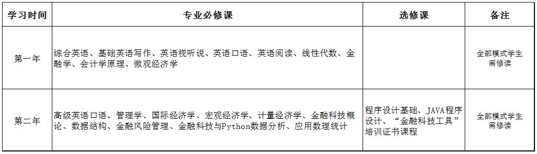 金融學(xué)專(zhuān)業(yè)與會(huì )計學(xué)專(zhuān)業(yè)在國內學(xué)習階段采用不分專(zhuān)業(yè)的大平臺課程設置,課程涵蓋英語(yǔ)強化課程,以及金融學(xué)和會(huì )計學(xué)專(zhuān)業(yè)的主干必修課程,專(zhuān)業(yè)課均使用原版英文教材,全英/雙語(yǔ)授課;在國外學(xué)習階段,學(xué)生可選擇經(jīng)濟學(xué)、金融學(xué)、會(huì )計學(xué)、國際經(jīng)濟與貿易、市場(chǎng)營(yíng)銷(xiāo)、管理學(xué)等國外對接院校的大部分商科專(zhuān)業(yè)。