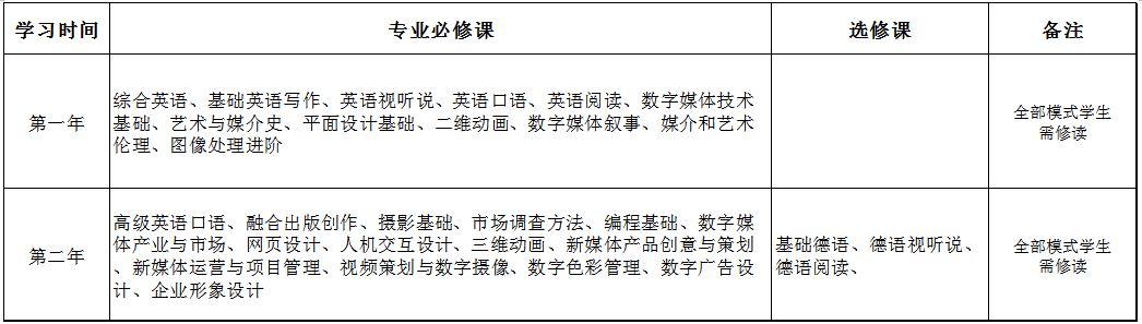 數字媒體藝術(shù)專(zhuān)業(yè)僅招收藝術(shù)類(lèi)(美術(shù))學(xué)生,該專(zhuān)業(yè)實(shí)行中英雙語(yǔ)小班授課、研討式和情景工作坊教學(xué),強化學(xué)生為主體的中德雙方共同制定的人才培養模式。第一、二學(xué)年在我校學(xué)習,第三、四學(xué)年赴國外合作大學(xué)學(xué)習,符合中外雙方學(xué)校畢業(yè)要求可獲雙方學(xué)校分別授予的學(xué)士學(xué)位證及我校授予的本科畢業(yè)證。因故不能出國學(xué)習的學(xué)生,可選擇在我校按普通類(lèi)專(zhuān)業(yè)人才培養方案修讀相應專(zhuān)業(yè)第三、四學(xué)年課程,滿(mǎn)足我校畢業(yè)要求可獲我校授予的學(xué)士學(xué)位證和本科畢業(yè)證。