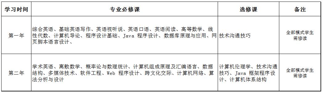 計算機與科學(xué)技術(shù)專(zhuān)業(yè)采用“2+2”中外聯(lián)合培養人才培養模式,第一、二學(xué)年在我校學(xué)習,第三、四學(xué)年赴國外合作大學(xué)學(xué)習,符合中外雙方學(xué)校畢業(yè)要求可獲雙方學(xué)校分別授予的學(xué)士學(xué)位證及我校授予的本科畢業(yè)證。因故不能出國學(xué)習的學(xué)生,可選擇在我校按普通類(lèi)專(zhuān)業(yè)人才培養方案修讀相應專(zhuān)業(yè)第三、四學(xué)年課程,滿(mǎn)足我校畢業(yè)要求可獲我校授予的學(xué)士學(xué)位證和本科畢業(yè)證。