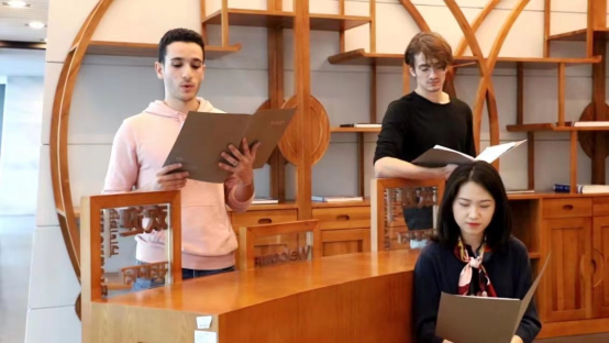(我校來(lái)華留學(xué)生共讀《紅樓夢(mèng)》經(jīng)典選段“劉姥姥進(jìn)大觀(guān)園”左:敘利亞來(lái)華留學(xué)生SHAHIN AMRO;中:俄羅斯來(lái)華留學(xué)生ALEKSEEV VLADISLAV;右:天河區民間文藝家協(xié)會(huì )秘書(shū)長(cháng)鄧筠昭。)